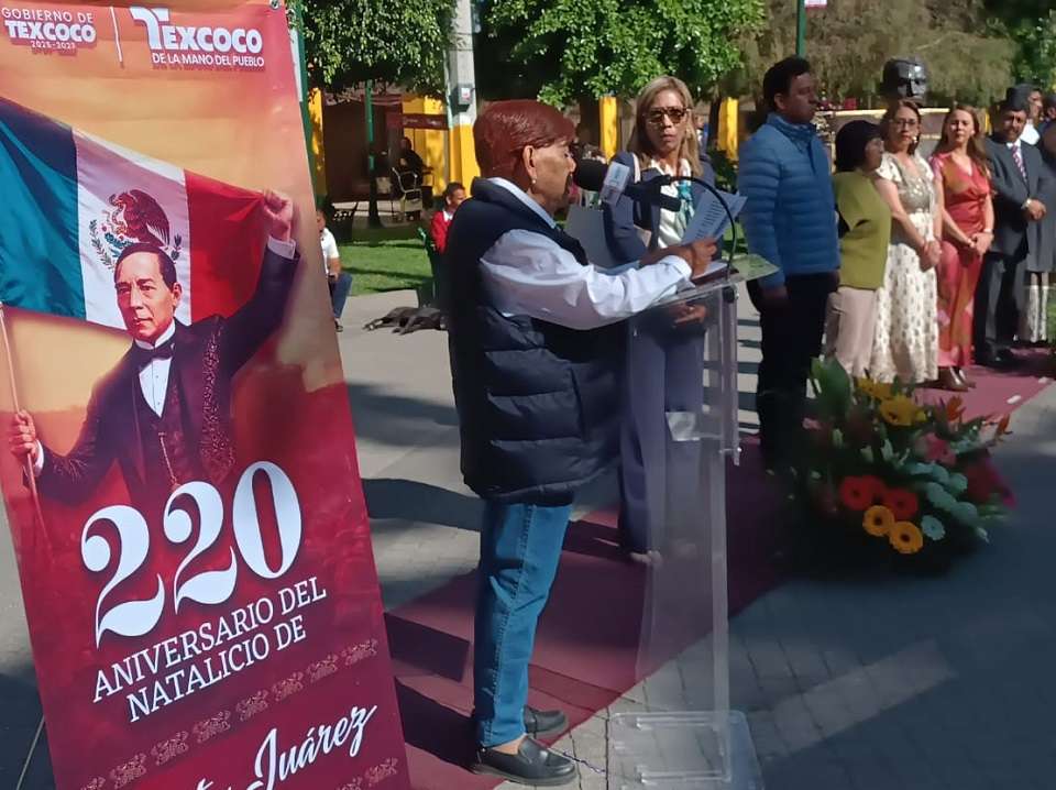 Previamente se realizó los honores al Lábaro Patrio, y seguidamente la participación de la Cronista Municipal de Texcoco, Maestras Martha Ortega Cantabrana referente a la trayectoria de Benito Juárez García, exhortando a todos los asistente y estudiantes a la reflexión, un hombre que trascendió en el ámbito mundial por su lema, ’Entre los hombres y las naciones, el respeto al derecho ajeno es la paz…